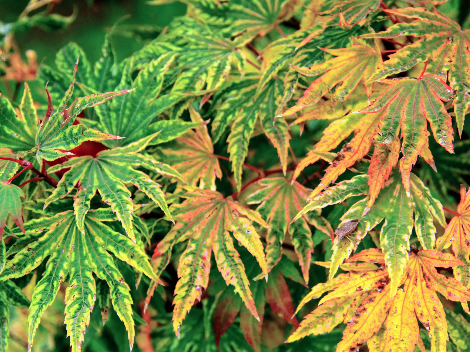 White variegated form with pink and corals in spring, orange red in fall. Lovely little tree. Zone 5